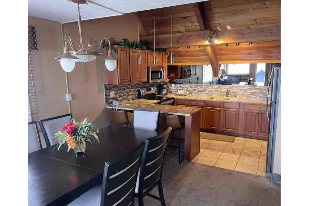 This unit has a sleeper sofa in the living room, a king-size bed in the master bedroom with a full bath. It also has a loft with two queen-size beds and a full bath. The unit has a fully equipped kitchen.