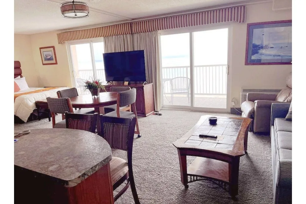 The Pinestead Reef Resort has 46 waterfront suites and is located on 700′ of sandy beach. Each of our forty-six bayside suites offers a spectacular view of East Grand Traverse Bay. All guest rooms are smoke free. Units have a full kitchen with dishwasher, flat screen TV’s with cable and HBO, in-room safe.